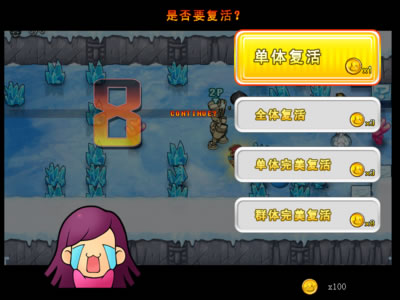 单体完美复活:只复活自己,复活后的玩家会持续短时间的无敌状态,角色恢复至满属性状态,生命值满,并加50点体力(不会突破体力上限),消耗3枚复活币;